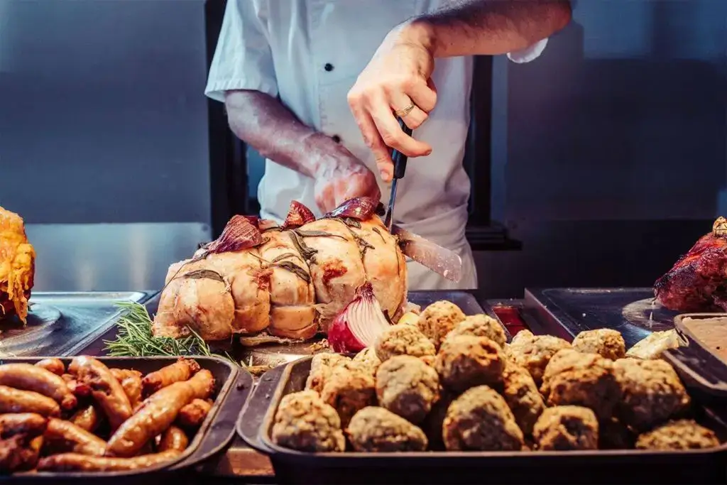 At Breckland Lodge in Norfolk, the carvery is all about honest flavours done with care. Perfectly roasted meats are carved generously, Yorkshire puddings rise golden and proud, and crisp potatoes give way to fluffy centres. Seasonal vegetables add freshness and balance, while rich gravies bring everything together. There’s a thoughtfulness here, from comforting vegetarian options to indulgent desserts that makes the experience warm, welcoming, and unmistakably British